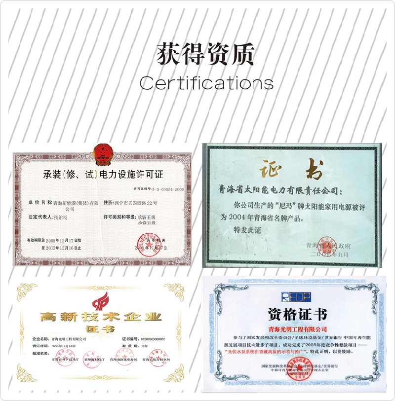 公司先后榮獲“全國(guó)專利先進(jìn)科技研究院”、“全國(guó)各族青年團(tuán)結(jié)進(jìn)步集體”、“青年文明號(hào)”,“青海省模范集體”,“全國(guó)教科文衛(wèi)系統(tǒng)先進(jìn)工會(huì)組織”、全省“學(xué)習(xí)型組織標(biāo)兵”單位、全國(guó)“創(chuàng)新性試點(diǎn)企業(yè)”、連續(xù)三年被中國(guó)農(nóng)業(yè)銀行青海分行授予“AAA信用企業(yè)”和“AAA優(yōu)良客戶”等榮譽(yù)稱號(hào)。公司擁有“尼瑪”牌太陽(yáng)能。